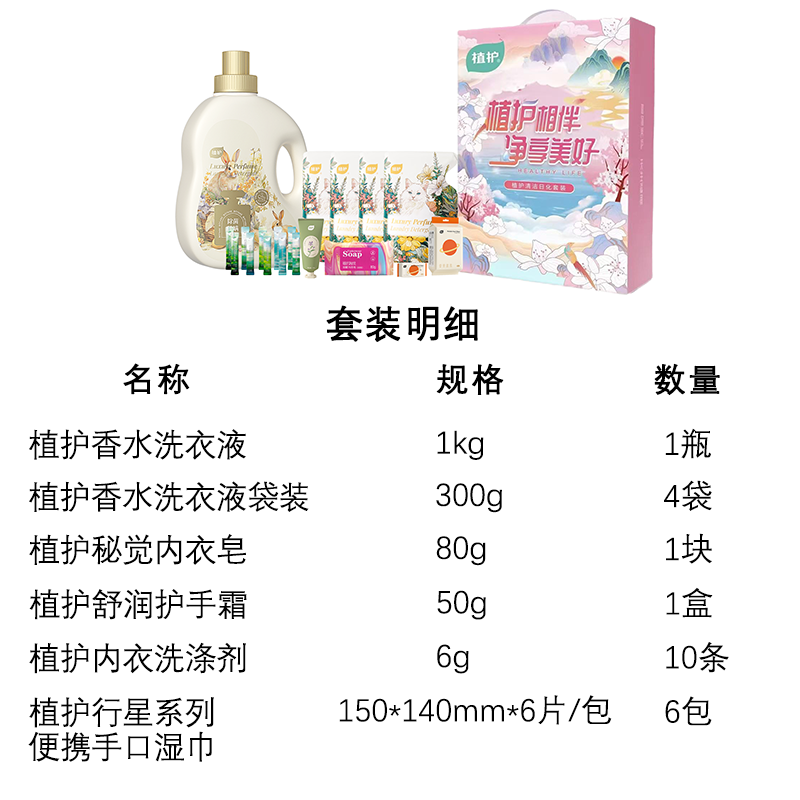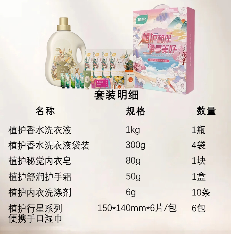 銷售規格:植護香水洗衣皂液1kg*1瓶+植護洗衣液袋裝300g*4袋+植護內衣洗滌劑6g*10袋+植護便攜手口濕巾 150*140mm*6片/包*6包+植護護手霜50g*1盒+植護內衣皂80g*1塊