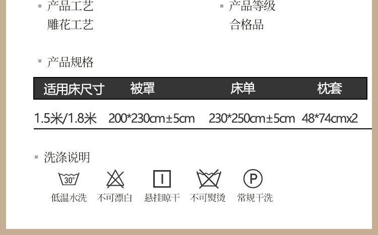 規格: 床單:230*250cm±5cm 被罩:200*230cm 枕套:48*74cmx2 面料:牛奶絨雕花絨(聚酯纖維) 重量:3.4KG 1、雙面牛奶絨面料擁有豐厚的絨毛,手感極其柔軟 2、特使工藝處理,內外循環,排汗速干 3、活性印染設計,色彩清晰耐看,久用如新