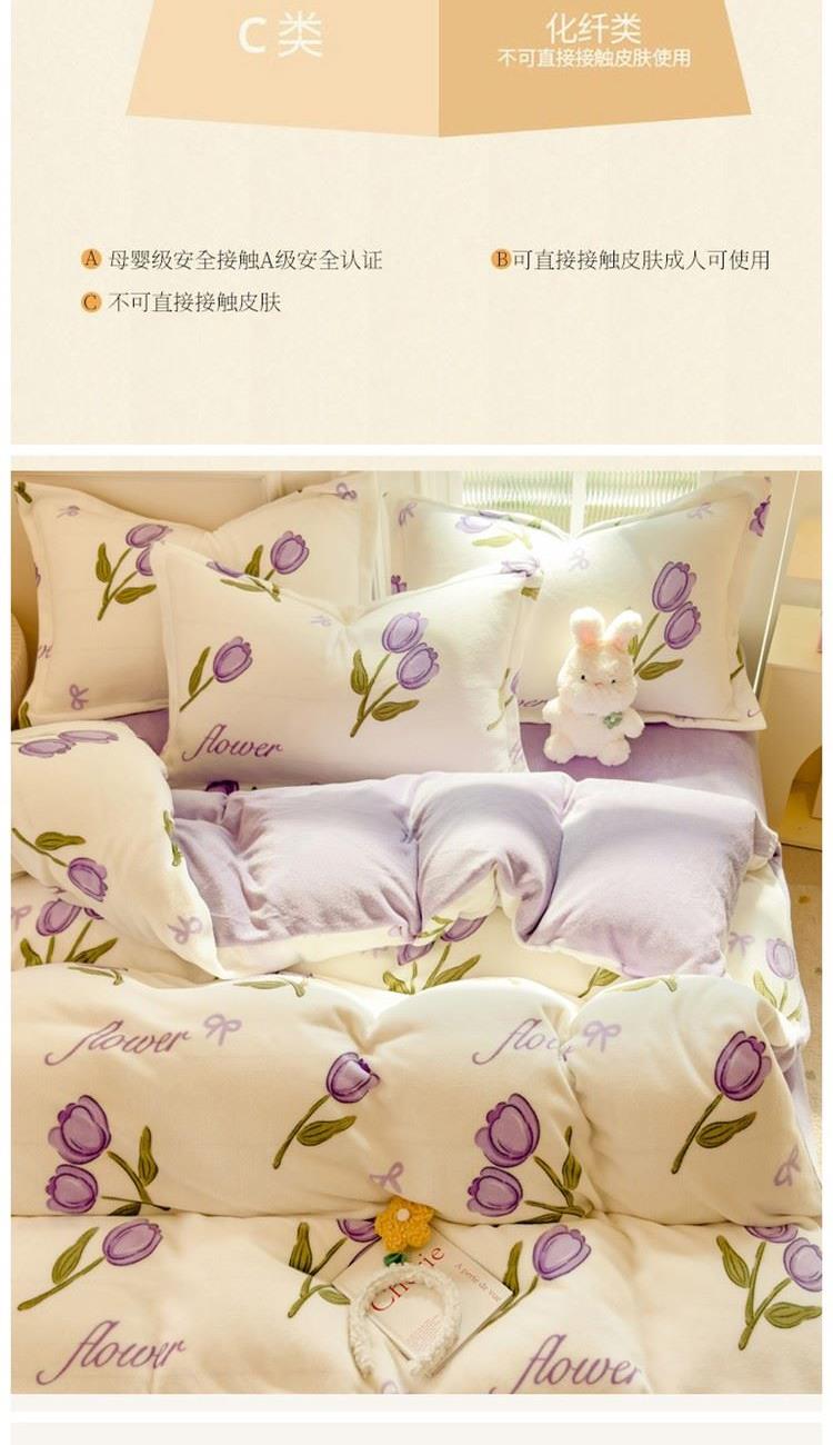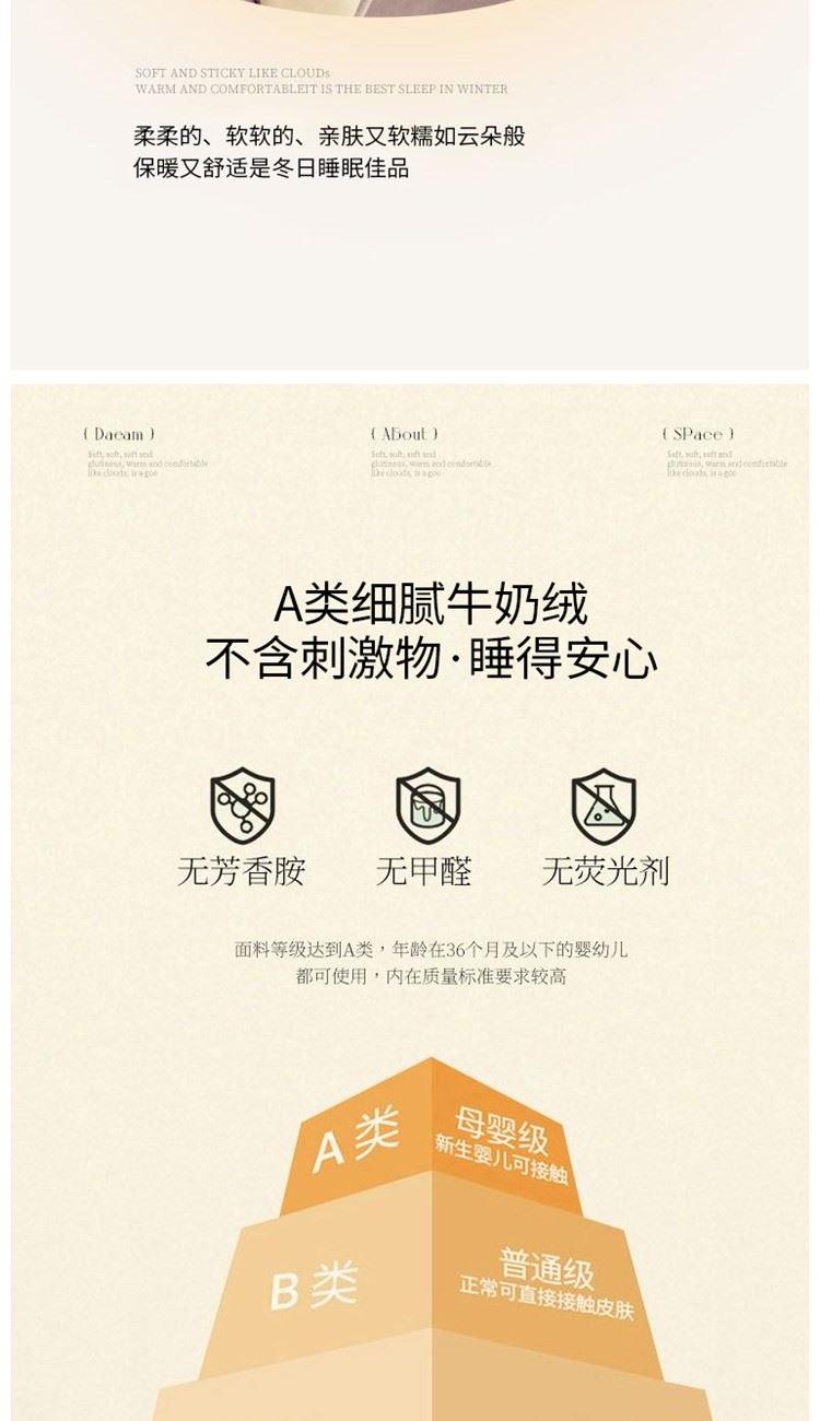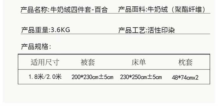 規格: 床單:230*250cm±5cm 被罩:200*230cm 枕套:48*74cmx2 面料:牛奶絨(聚酯纖維) 重量:3.6KG 1、牛奶絨高密套件,擁有豐厚的絨毛,手感極其柔軟 2、活性印染設計,色彩清晰耐看,久用如新 3、同款印花設計,又搭配寬邊工藝,臥室更暖心